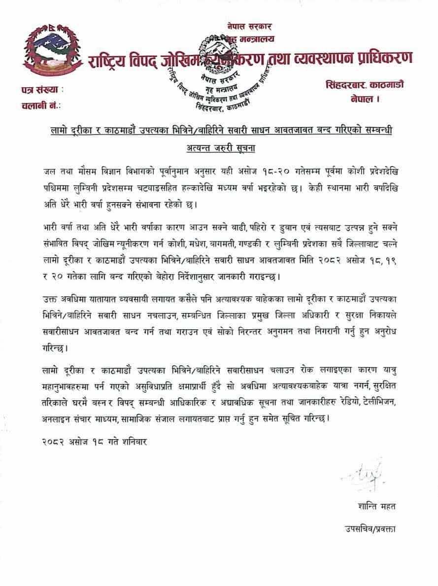 राष्ट्रिय विपद् जोखिम न्यूनीकरण तथा व्यवस्थापन प्राधिकरणले शनिबार एक अत्यन्त जरुरी सूचना जारी गर्दै असोज १८, १९ र २० गतेसम्मका लागि यातायात बन्द गर्ने निर्णय गरेको हो।